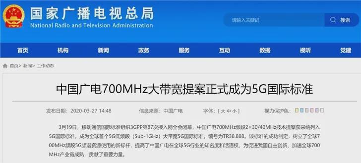 ICC訊 根據(jù)國(guó)家廣播電視總局官網(wǎng)消息,3月19日,3GPP第87次接入網(wǎng)全會(huì)閉幕。中國(guó)廣電700MHz頻段2×30/40MHz技術(shù)提案獲采納列入5G國(guó)際標(biāo)準(zhǔn),成為全球首個(gè)5G低頻段(Sub-1GHz)大帶寬5G國(guó)際標(biāo)準(zhǔn),編號(hào)為T(mén)R38.888。