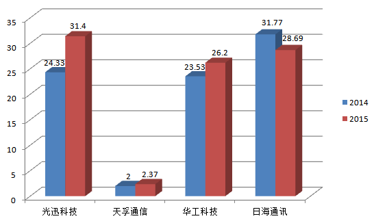 沖在前頭的光迅科技2015年?duì)I收突破30億元,同比增長(zhǎng)29.06%;凈利潤(rùn)2.43億元,同比增長(zhǎng)68.79%。營(yíng)收利潤(rùn)雙雙取得了較大幅度增長(zhǎng)。以營(yíng)收計(jì),光迅科技已經(jīng)位居全球光器件十強(qiáng)第五位。而且營(yíng)收的含金量很高:研發(fā)投入占營(yíng)收比重近10%,科技創(chuàng)新收入和科技成果轉(zhuǎn)化收入占營(yíng)業(yè)收入比接近30%。從產(chǎn)品看,光迅科技全年有源芯片產(chǎn)出同比增長(zhǎng)30%,器件增長(zhǎng)50%,光模塊增長(zhǎng)10%;無源產(chǎn)品保持同比增長(zhǎng)20%,子系統(tǒng)同比增長(zhǎng)54%??梢姽庋缚萍祭^續(xù)保持良好勢(shì)頭。