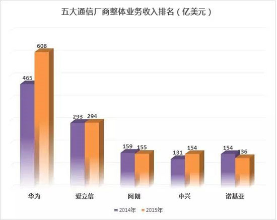 領(lǐng)頭羊華為繼在2013年實(shí)現(xiàn)對(duì)愛立信的超越之后,連續(xù)兩年以20%-30%的增長(zhǎng)速度拉開了與第二名愛立信的收入差距,特別是2015年的增長(zhǎng)速度達(dá)到了驚人的37%,幾乎使得"原地踏步"的愛立信的整體業(yè)務(wù)收入只有華為的一半了。