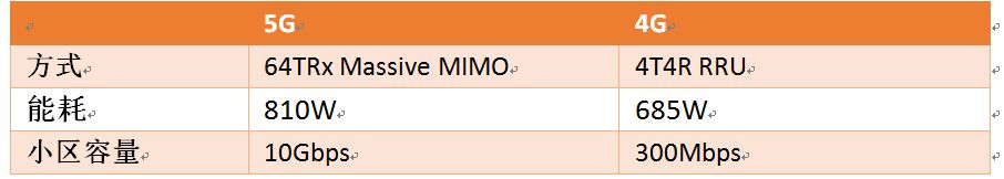 在運營商的5G站點中,我們通過對比5G 64TRx Massive MIMO與4G 4T4R RRU發(fā)現(xiàn),兩者能耗分別是810W和685W,基本上是在一個數(shù)量級,但是兩者提供的小區(qū)容量分別是10Gbps和300Mbps,前者是后者的30多倍。
