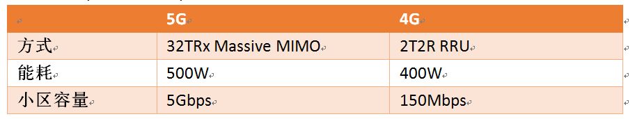 5G 32TRX Massive MIMO與4G 2T2R RRU相比,單模塊功耗分別是500W和400W,但是小區(qū)容量分別是5Gbps和150Mbps, 前者是后者的30多倍。