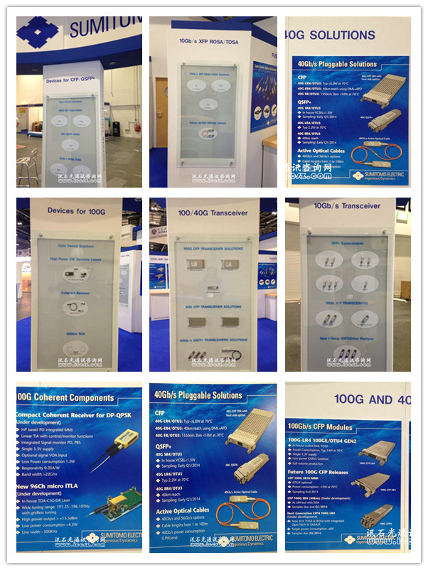 住友電工本次ECOC展出的新品有DWDM XFP 平臺,傳輸速率可達11.3Gb/s,擁有43通道的100G 密集波分復(fù)用器,更低功率損耗。還有10G相關(guān)配套產(chǎn)品,1310nm DML XMD-MSA TOSA等。100G/40G相關(guān)的QSFP+相關(guān)模塊和產(chǎn)品為展出重點,有40G-SR4和40G-LR4/ER4,以及正在開發(fā)的100G的CFP4產(chǎn)品和配套的TOSA和ROSA產(chǎn)品。同時還有推出100G相干收發(fā)器產(chǎn)品如相干接收器,1310nm SOA高功率可調(diào)激光器等。CFP/QSFP+ 產(chǎn)品為住友電工本次出展的重點也是本次展會的熱點,推出產(chǎn)品涉及有100G 40G CFP TOSA/ROSA及模塊, 40G QSFP+ROSA及模塊,25Gb/s ROSA/TOSA。