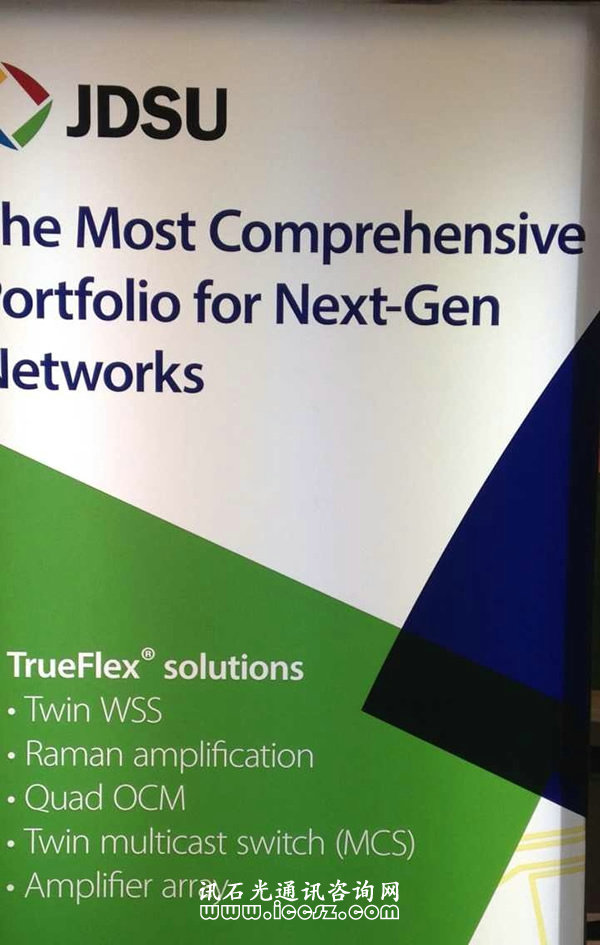 JDSU在本次展會上推出是針對下一代網(wǎng)絡(luò)的廣泛的產(chǎn)品組合有TrueFlex解決方案,包括有TWIN WSS,Raman amplification,Quad OCM,Twin multicast switch , Amplifier array。還有推出從芯片到系統(tǒng)的針對100G及以上網(wǎng)絡(luò)的ONT CFP2 ,據(jù)介紹該ONT支持CFP2設(shè)備的所有二代100G挑戰(zhàn),并且也支持基于25/28G I/O的CFP425/28G 輸入輸出。