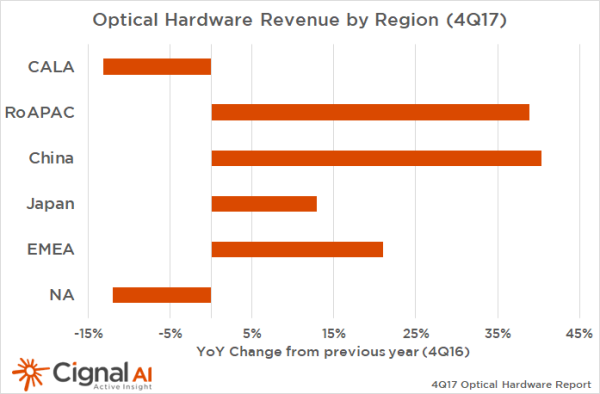 ICCSZ訊(編譯:Nina)近日,專門研究光網(wǎng)絡(luò)器件和設(shè)備的市場調(diào)研公司Cignal AI發(fā)布了2017年第四季度光硬件報告。報告指出,2017年,隨著開支的增長和大型設(shè)備供應(yīng)商越來越受歡迎,亞洲和EMEA(歐洲、中東和非洲)成為光硬件市場的亮點;同時,由于傳統(tǒng)運營商開支下滑,北美市場光網(wǎng)絡(luò)開支低于預(yù)期。