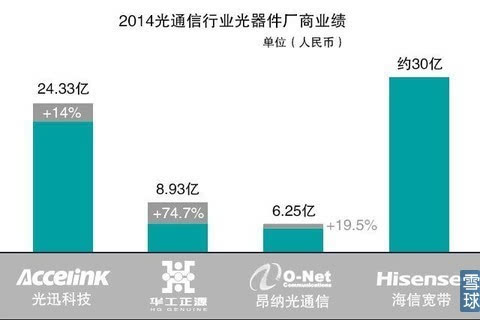 2014年幾大器件商整體表現(xiàn)出色。作為國內(nèi)光通信器件的領(lǐng)頭羊,光迅科技2014年取得了24.33億元的營收,同比增長了14%??鄢a助減少的因素,其凈利潤也保持了穩(wěn)定的增長。