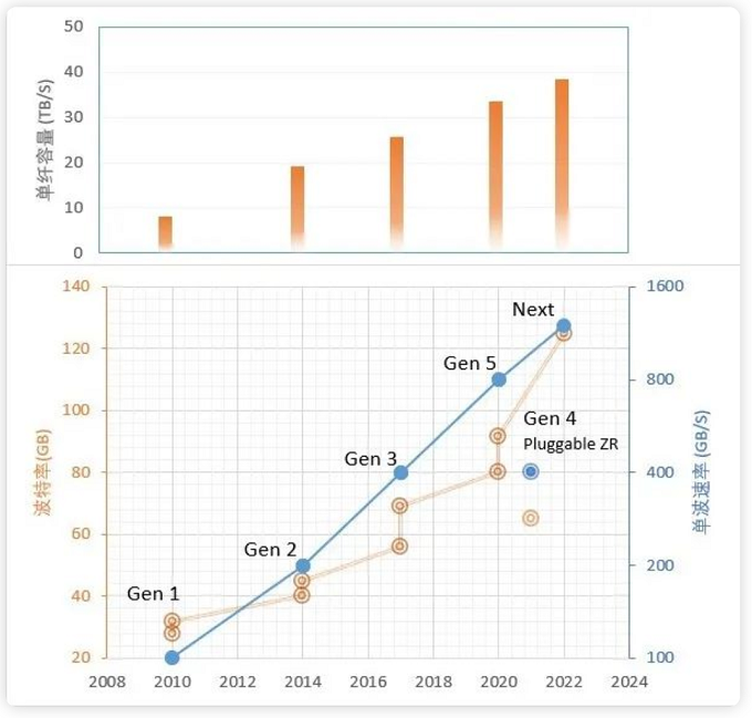 圖 3 電層單波速率和單纖容量的演化圖
