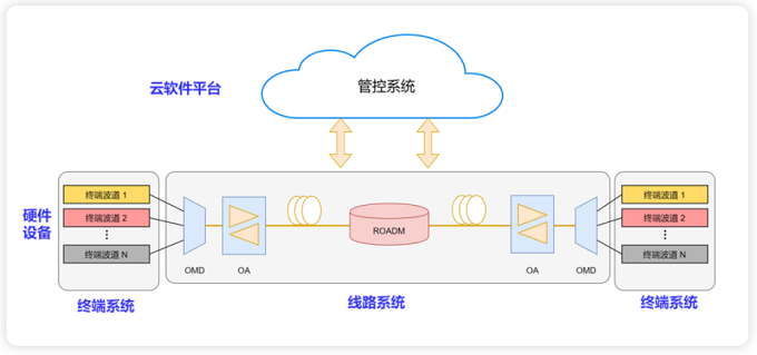 DCI網(wǎng)絡可以看成由底層硬件設備和上層管控軟件共同組成,其中設備分為光層設備和電層設備,兩者的角色類比于城市的交通設施,光層設備類似基礎道路,電層設備則是路上的交通工具。同電層技術的快速演化相比,光層設備屬于基礎設施中的基礎設施,技術演進相對較慢,往往都會超期服役。所以,解耦的第一刀就切在這里,把公路和交通工具分割開,把光層和電層解耦。光層設備和電層設備來自不同廠家,同時在一套光層設備組成的“公路”上,可以支持來自不同電層設備廠家的“交通工具”。