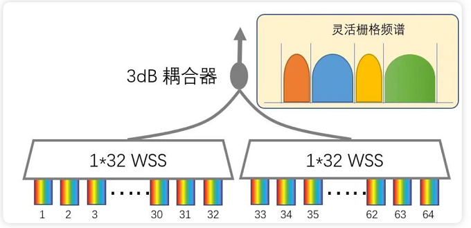 圖 6 靈活合分波單元與靈活柵格頻譜,為了支持更多的上下路端口,需要將兩個WSS進行合并