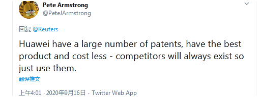 對于蓬佩奧的說法,有英國網(wǎng)友PeteArmstrong評論說,“華為擁有大量專利,擁有最好的產(chǎn)品以及很低的成本——競爭對手總會一直有,所以只管去用它們?!薄?