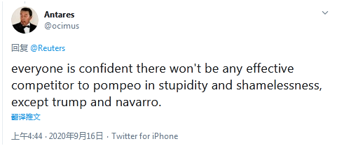 美國網(wǎng)友Antares則調(diào)侃式地寫道:“所有人都相信在愚蠢與無恥方面不會有任何有力對手能與蓬佩奧抗衡,除了特朗普與納瓦羅。”↓