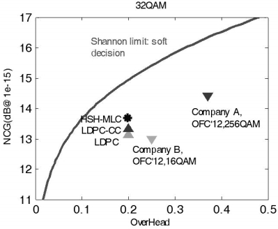 按照前述香農(nóng)極限的分析,如果單純采用高階調(diào)制碼型增大系統(tǒng)的傳輸容量,就需要更高的信噪比,會(huì)縮短傳輸距離。如果單純地提高入纖功率,又會(huì)增大非線性效應(yīng)。根據(jù)業(yè)界已經(jīng)發(fā)表的文獻(xiàn),采用32QAM以上高階調(diào)制碼型,在SMF+EDFA的鏈路上只能傳輸幾百公里。而某些“英雄實(shí)驗(yàn)”中采用的特殊新型光纖,目前還不具備商用的可行性。在Flex 2T的ODSP算法中,采用了一系列創(chuàng)新技術(shù),在大幅提升系統(tǒng)容量(即頻譜效率)的同時(shí),也能實(shí)現(xiàn)長(zhǎng)距傳輸。