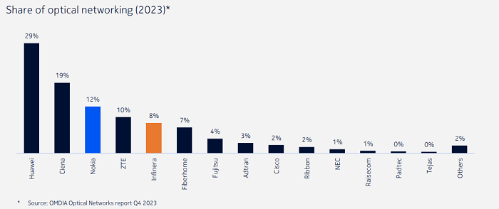 該交易結(jié)合了光網(wǎng)絡(luò)設(shè)備市場上的兩個主要參與者,將使?jié)撛诳蛻舻倪x擇更少。總部位于美國加利福尼亞州的光學(xué)設(shè)備專家Infinera去年的銷售額為16億美元,其大部分收入(約60%)來自北美。諾基亞的光學(xué)部門是其網(wǎng)絡(luò)基礎(chǔ)設(shè)施業(yè)務(wù)集團(tuán)(Network Infrastructure Business Group)的一部分,2023年的銷售額約為19億歐元(20億美元),其大部分業(yè)務(wù)都在其他地區(qū)開展。諾基亞堅稱,雙方客戶重疊是有限的——大概是希望任何擔(dān)心對競爭產(chǎn)生負(fù)面影響的當(dāng)局都能明白這一點。