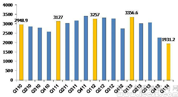 下面來看一組關(guān)于2010年一季度至2014年一季度我國移動用戶數(shù)季度增長情況的圖表: