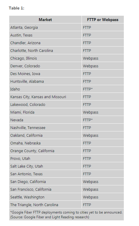 以下是谷歌Fiber目前和計(jì)劃的服務(wù)部署的更新視圖,部署集中在FTTP或Webpass固定無線接入平臺: