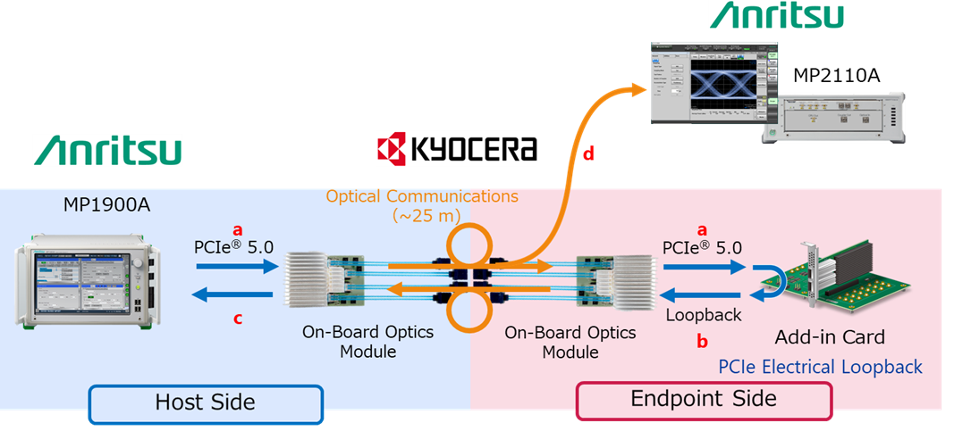 在OFC2023上進行的演示將介紹模擬CPU主機側(cè)的安立MP1900A,和位于與端點AIC的設(shè)備連接處的KYOCERA板載光模塊。下圖中的“a”至“d”解釋如下: