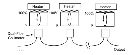 色散補(bǔ)償范圍和工作帶寬有限。通過多個GT標(biāo)準(zhǔn)具級聯(lián),參見圖2中的配置,結(jié)合標(biāo)準(zhǔn)具內(nèi)光學(xué)介質(zhì)的熱光效應(yīng),通過加熱器改變溫度,精確控制每個標(biāo)準(zhǔn)具群時(shí)延曲線的峰值波長位置,不僅實(shí)現(xiàn)大范圍的色散量調(diào)節(jié),同時(shí)也拓寬了通道工作帶寬,可用于系統(tǒng)的可調(diào)