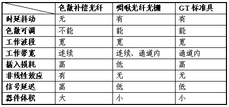 色散補(bǔ)償光纖、啁啾光纖光柵、GT標(biāo)準(zhǔn)具這三種技術(shù)方案。