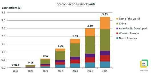 中國(guó)將成為推動(dòng)5G普及的重要組成部分。該研究公司現(xiàn)在預(yù)計(jì),到今年年底,中國(guó)將有近1億個(gè)5G連接,到2024年將增加到10億以上。