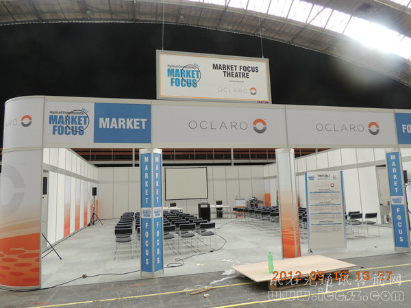 展區(qū)又一大重點區(qū)域Market Focus Theatre ,桌椅已擺放整齊,明日將有不少市場產(chǎn)品簡報發(fā)布,贊助商OCLARO 新LOGO清晰可見。