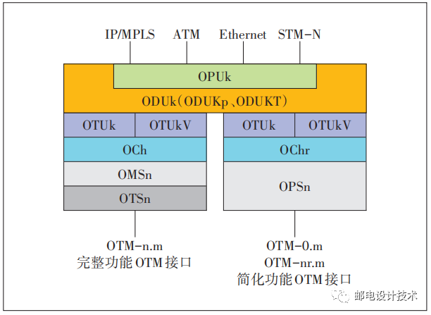 ITU-T G.709協(xié)議定義了OTN接口的信息結(jié)構(gòu),如圖2所示,OTM-n.m為完整功能OTM接口,OTM-0.m和OTM-nr.m為簡化功能OTM接口。這幾種接口的速率和幀格式均符合ITU-T G.709建議,為標準OTN接口。目前在核心匯聚層廣泛使用的OTN設備接口為OTM-n.m,又叫彩光接口。灰光接口的信息結(jié)構(gòu)為OTM-0.m,即為簡化功能OTM接口。