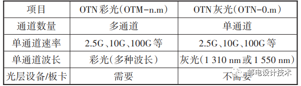 彩光接口和灰光接口的比較如表1所示,彩光接口通道多、容量大,需要單獨配置光子架,比如目前核心匯聚層廣泛使用的80×100G OTN。灰光接口為單通道,不需要配置光子架。