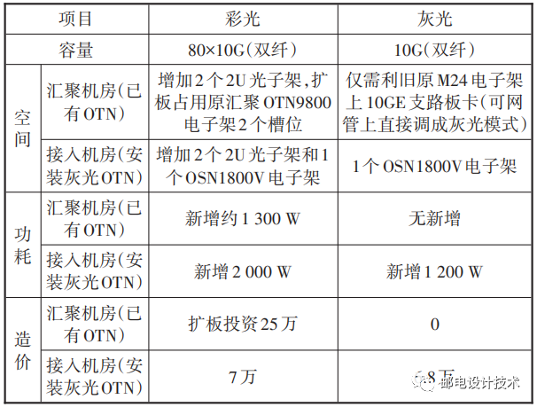 在具體組網(wǎng)上,以中國移動某分公司某廠家OTN網(wǎng)絡為例,灰光和彩光模式的優(yōu)劣比較如表2所示,該公司核心匯聚層已部署某廠家OSN9800設備并組建80×100G環(huán)網(wǎng),在接入機房部署OSN1800V設備,采用灰光模式或彩光模式上連匯聚層,在同是單通道10G速率下比較,后續(xù)章節(jié)會對單通道速率的選擇進行具體分析。