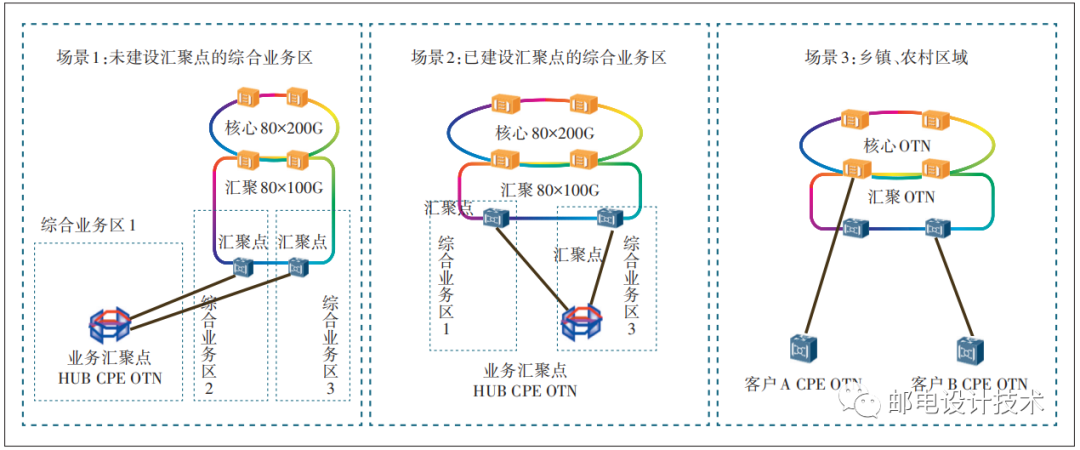 OTN接入層以綜合業(yè)務區(qū)為單位,分場景進行OTN接入環(huán)建設,如圖3所示。