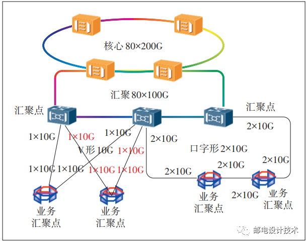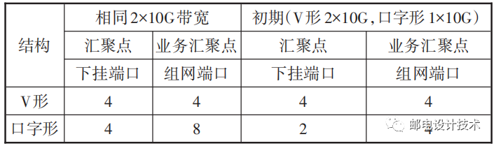 在相同網(wǎng)絡容量下,比如同為2×10G,V字形和口字形均需使用2對纖芯,纖芯消耗量一致,所以2種拓撲的優(yōu)劣僅需從端口占用情況進行比較,V字形和口字形拓撲比較如表4所示。在相同帶寬情況下,V字形更節(jié)省端口;而在建網(wǎng)初期,V字形由于容量大,占用匯聚點端口也更多。
