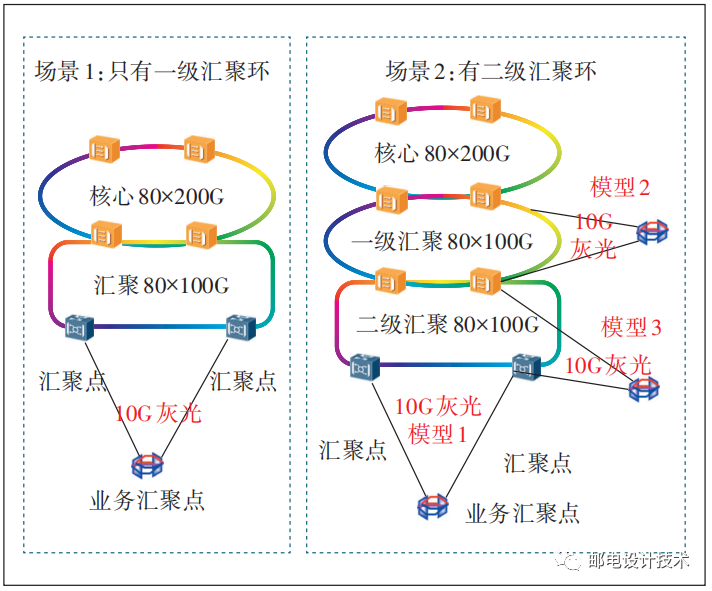 從表2對比可以看出,采用灰光模式對二級匯聚點影響最小(二級匯聚點利舊現(xiàn)有板卡,不用額外占用機房空間和電源功耗),價格也最低。但后期如需擴容,需增加1對纖芯,考慮到接入層纖芯豐富,纖芯問題不是瓶頸。