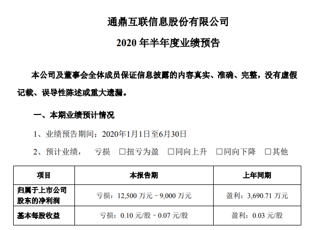 ICC訊 (編輯:Nicole)通鼎互聯信息股份有限公司(以下簡稱:通鼎互聯)發(fā)布2020年半年度業(yè)績預告:預計2020年上半年度業(yè)績虧損,歸屬于上市公司股東的凈利潤虧損12,500 萬元–9,000 萬元,去年同期實現盈利3,690.71 萬元。