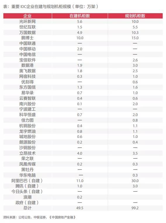 中銀證券分析了34 個(gè)主流數(shù)據(jù)中心企業(yè)之后,認(rèn)為目前數(shù)據(jù)中心基本上能夠滿足需求。工信部公布的2018 年數(shù)據(jù)顯示,全國(guó)數(shù)據(jù)中心的利用率在60% 以下。但是中銀證券也發(fā)現(xiàn),這34 家企業(yè)公開(kāi)在建和規(guī)劃建設(shè)的機(jī)柜數(shù)合計(jì)在150 萬(wàn)架,比現(xiàn)有的機(jī)柜數(shù)量增長(zhǎng)67%,接近七成的增長(zhǎng)反映了行業(yè)對(duì)于數(shù)據(jù)中心投入的熱情,這也預(yù)示著下游需求將進(jìn)入爆發(fā)式的增長(zhǎng)階段。