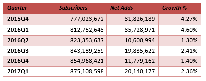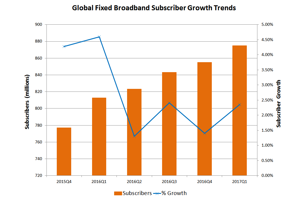 ICCSZ訊(編譯:Vicki)Point Topic 公布了2017 Q1季度的的寬帶用戶數(shù)據(jù)。Q117全球固網(wǎng)寬帶用戶數(shù)量環(huán)比增長2.63%。固網(wǎng)寬帶用戶總數(shù)為8.751億。