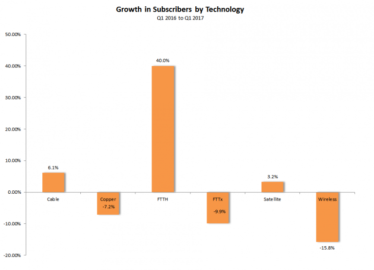 在年度變化方面,全球的銅線數(shù)量下降了7%, 而FTTH用戶數(shù)在2016年第一季度到2017年第一季度之間上升了40% (圖6)。這個(gè)數(shù)字與之前一個(gè)季度相比略有所下降,但是光纖替代銅線的趨勢依然明顯。FTTX的負(fù)增長主要是由于FTTH在中國大規(guī)模的替代了FTTX.同時(shí),固定的無線技術(shù)在逐漸的給基于4G LTE的移動(dòng)寬帶接入鋪路。實(shí)際上,在一些國家和地區(qū)這被認(rèn)為是一種提供家庭連接寬帶的方式,例如斯堪的納維亞和東歐。