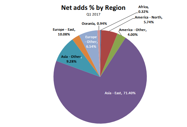在2017年第一季度,固網(wǎng)寬帶的凈增加額的71% 來自東亞,高于2016年第四季度的49%(圖3)。該地區(qū)的季度增長率是所有地區(qū)中最高的,增長率為3.9% (圖4)。