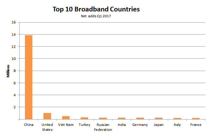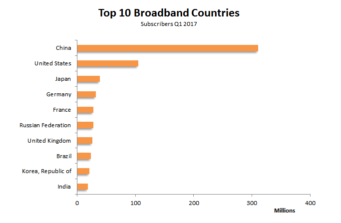圖7 2017 Q1 排名前十的國家的寬帶用戶數(shù)