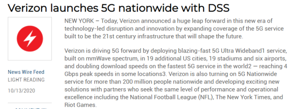 ICC訊(編譯:Nina)本周二(2020年10月13日),Verizon宣布擴(kuò)大5G服務(wù)的覆蓋范圍。該運(yùn)營商通過在美國另外19個(gè)城市、19個(gè)體育館和6個(gè)機(jī)場中部署基于毫米波頻譜的超快5G超寬帶服務(wù)(5G Ultra Wideband service)(超寬帶僅在部分城市提供)來推動(dòng)5G向前發(fā)展,并且將5G下載速度提高了一倍--在某些位置達(dá)到4Gbps峰值速度。Verizon還將為美國超過2億人口開啟5G全國服務(wù)(5G National Service),并與尋求同樣水平的性能和卓越運(yùn)營的合作伙伴一起開發(fā)新解決方案,它們包括國家橄欖球聯(lián)盟(NFL)、《紐約時(shí)報(bào)》和Riot Games。