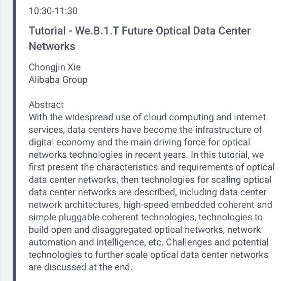 學(xué)術(shù)會(huì)議上的Tutorial是針對(duì)當(dāng)前熱門(mén)技術(shù)全面系統(tǒng)的特邀報(bào)告,是會(huì)議中等級(jí)最高的特邀技術(shù)報(bào)告,只有在該領(lǐng)域多年持續(xù)創(chuàng)新的團(tuán)隊(duì)和個(gè)人才有可能獲此殊榮。在今年ECOC上阿里云基礎(chǔ)設(shè)施網(wǎng)絡(luò)團(tuán)隊(duì)獲得一個(gè)tutorial邀請(qǐng)報(bào)告,報(bào)告題目為“Future Data Center Optical Networks”。在一個(gè)小時(shí)的tutorial報(bào)告中,阿里云首先討論了云數(shù)據(jù)中心對(duì)光網(wǎng)絡(luò)的要求、數(shù)據(jù)中心互聯(lián)光網(wǎng)絡(luò)的特點(diǎn),并全面系統(tǒng)地描述了數(shù)據(jù)中心互聯(lián)光網(wǎng)絡(luò)架構(gòu)和相關(guān)的技術(shù)。然后重點(diǎn)描述了阿里云過(guò)去幾年在該領(lǐng)域的創(chuàng)新,包括開(kāi)放線(xiàn)路系統(tǒng),光層異構(gòu)的開(kāi)放解耦MESH網(wǎng)絡(luò),白盒光傳輸設(shè)備,開(kāi)源光網(wǎng)絡(luò)操作系統(tǒng),光網(wǎng)絡(luò)速率持續(xù)提升并保持功耗和體積持續(xù)降低的技術(shù),以及在光網(wǎng)絡(luò)數(shù)字化、自動(dòng)化和智能化方面的創(chuàng)新工作。報(bào)告最后對(duì)未來(lái)技術(shù)發(fā)展方向進(jìn)行了探討,包括如何繼續(xù)實(shí)現(xiàn)速率和容量的10倍提升、以及快速動(dòng)態(tài)重組在實(shí)際網(wǎng)絡(luò)中的實(shí)現(xiàn)和規(guī)模部署等。