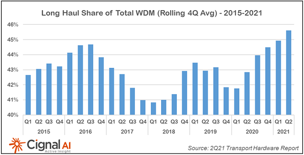 Cignal AI傳輸硬件首席分析師Kyle Hollasch表示:“盡管目前存在半導(dǎo)體供應(yīng)鏈問題,但隨著運(yùn)營商購買額外的高性能長途W(wǎng)DM相干設(shè)備,北美支出應(yīng)該會(huì)在2021年下半年加速。長途線路系統(tǒng)能夠支持更寬和可變的通道間隔,更高的度數(shù),擁有改進(jìn)的分插能力,成為運(yùn)營商現(xiàn)在進(jìn)行投資的有力理由?!?
