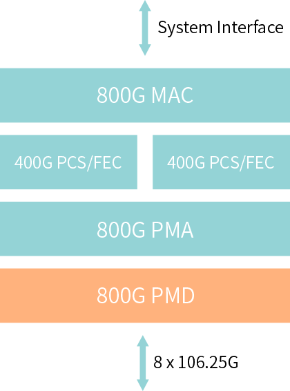 目前,IEEE還沒有制定800G以太網(wǎng)的標(biāo)準(zhǔn),但以太網(wǎng)技術(shù)聯(lián)盟(ETC)已經(jīng)在2020年4月制定了用于800G以太網(wǎng)的800GBASE-R規(guī)范。ETC宣稱該規(guī)范盡可能地利用400GbE的標(biāo)準(zhǔn)來建立一個800GbE MAC和PCS規(guī)范,并降低用戶在以太網(wǎng)端口上實(shí)現(xiàn)多速率的成本。800GBASE-R規(guī)范采用的仍然是400G以太網(wǎng)中現(xiàn)有的106.25G通道,目的是將PCS的總通道數(shù)增加一倍(也就是從4條增加到8條)。