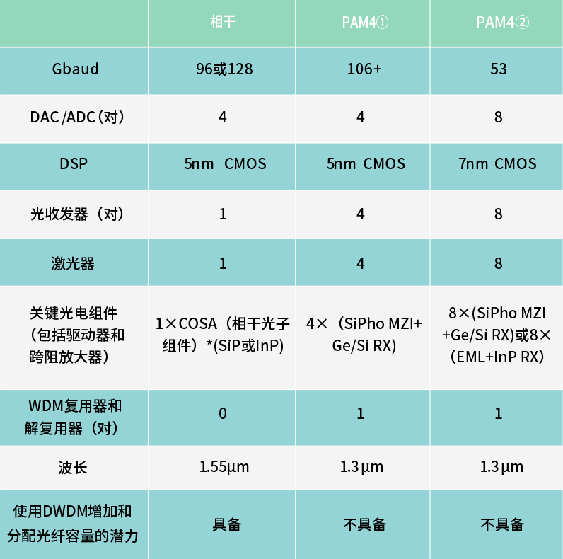 下表總結(jié)了以上描述,以比較三種800G光模塊配置。