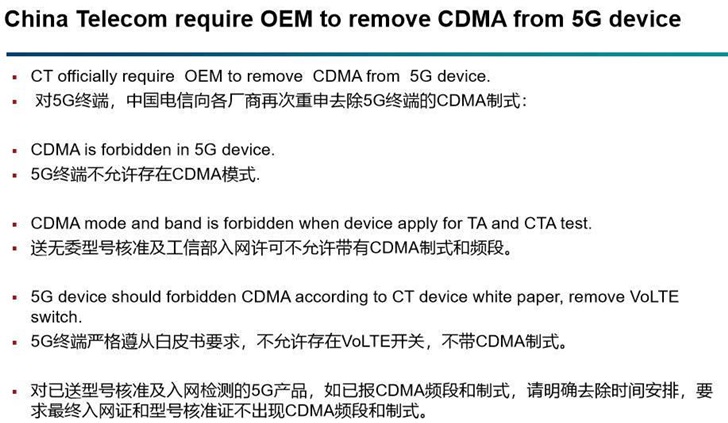 有消息人士稱,中國電信要求從 2020 年起,所有 5G 終端不允許存在 CDMA 頻段和制式,同時要求不允許存在 VoLTE 開關;如果已報 CDMA 頻段和制式,需要明確去除時間安排,最終入網(wǎng)證和型號核準證不允許出現(xiàn) CDMA 頻段和制式。
