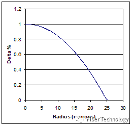 折射率拋物線分布公式如下,相對(duì)折射率差為1%,阿爾法定義了折射率分布的曲率,理想情況下,阿爾法為2,但是由于材料色散的影響,阿爾法應(yīng)該增大,以抵消材料色散的影響。