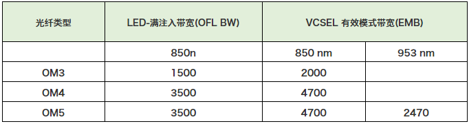 由于多模光纖本身的特點(diǎn),有多達(dá)19個(gè)模式組可以在多模光纖中傳輸,如果不加以精確控制,其模式之間的色散可能非常大。如果采用VCSEL,模式色散一般通過有效模式帶寬EMB進(jìn)行反映,如果采用LED,則用滿注入帶寬OFL BW來(lái)表示。