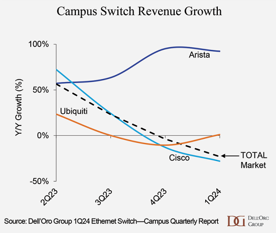 ICC訊(編譯:Nina)根據(jù)Dell'Oro Group的研究,2024年第一季度,全球園區(qū)交換機(Campus Switch)收入同比下降了23%。園區(qū)交換機收入同比增長的僅有兩家供應商是Arista和Ubiquiti。思科的園區(qū)交換機收入下降幅度超過了全球平均水平。
