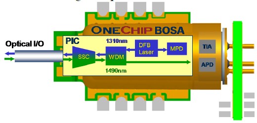 從產(chǎn)品圖上,可以看到,這款基于InP的光子集成芯片上集成了DFB分布反饋激光器、APD光電檢測器和SSC光電轉(zhuǎn)換器和WDM波分器等無源器件,包括一個TIA跨阻抗放大器。而且該產(chǎn)品只需一次外延生長,從而可以顯著降低成本。但是光子集成良品率相對較低,對于OneChip光模塊的良品率問題,Steve Bauer表示暫時還不便透露,但強調(diào)成本一定比傳統(tǒng)的光模塊廠商更低。他同時表示,產(chǎn)品性能也已經(jīng)獲得了客戶的認可。