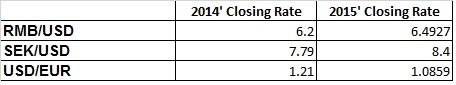 解讀之前需要說(shuō)明的是,五家通信廠商總部分處不同國(guó)家,因此財(cái)報(bào)數(shù)據(jù)所用貨幣單位也各不相同:華為和中興采用人民幣,愛(ài)立信采用瑞典克朗,諾基亞和阿朗采用歐元。為便于比較,按照各廠家財(cái)報(bào)里使用的如下年終記賬匯率統(tǒng)一折算為第三方貨幣,以美元來(lái)核算。但由于2015年美元相對(duì)于人民幣、瑞典克朗和歐元的升值幅度不一致,所以幣值的轉(zhuǎn)換會(huì)對(duì)數(shù)字結(jié)果造成一定的影響,在具體分析中會(huì)予以說(shuō)明: