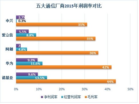中興掉隊(duì)的風(fēng)險(xiǎn),還體現(xiàn)在五大通信設(shè)備廠商在2015年盈利能力對(duì)比之中。