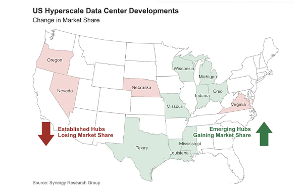Synergy Research Group首席分析師John Dinsdale表示:“隨著基礎(chǔ)設(shè)施限制日益加劇以及市場格局持續(xù)變化,超大規(guī)模提供商正越來越多地將資本重新配置到美國中部地區(qū),德克薩斯州已成為主要焦點。一波新的千兆瓦級園區(qū)正在非傳統(tǒng)地點形成,例如阿比林、芒特普萊森特、南本德、埃爾帕索、布恩縣和堪薩斯城。雖然現(xiàn)有的數(shù)據(jù)中心樞紐仍將具有戰(zhàn)略重要性,但新超大規(guī)模投資的重心顯然正在轉(zhuǎn)移到其他地方。”