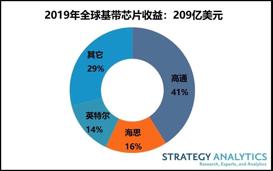 Strategy Analytics這份研究報告指出,高通、海思、英特爾、聯(lián)發(fā)科和三星LSI在2019年占據(jù)了全球蜂窩基帶處理器市場前五名的收益份額。高通以41%的收益份額領(lǐng)先,其次是海思16%,英特爾占14%。