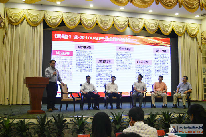 精彩的演講過后,會(huì)議迎來了第一個(gè)話題討論,談?wù)?00G產(chǎn)業(yè)鏈的結(jié)構(gòu),話題由大德激光總裁楊亞濤主持,參與嘉賓包括中國聯(lián)通首席專家唐雄燕、烽火網(wǎng)絡(luò)產(chǎn)出線市場部經(jīng)理唐正超、Lumentum研發(fā)經(jīng)理李兆明、新飛通研發(fā)測試部高級(jí)主任莊禮杰、廣州隆潤總經(jīng)理范衛(wèi)星。